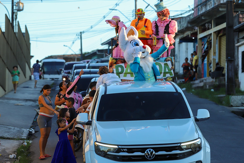 A Prefeitura de Manaus, por meio do Fundo Manaus Solidária (FMS), promoveu, neste domingo, 22/3, a chegada do Coelhinho da Páscoa no bairro Cidade de Deus, na zona Norte. A programação visa descentralizar as festividades, levando o espírito lúdico da data para comunidades periféricas.