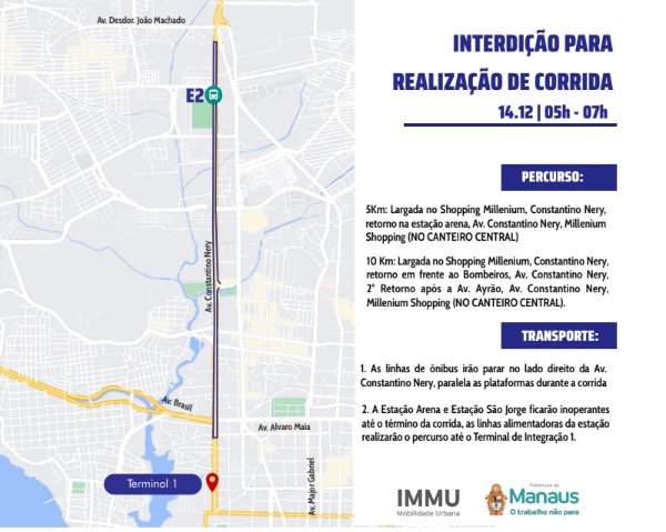A Prefeitura de Manaus, por meio do Instituto Municipal de Mobilidade Urbana (IMMU), comunica que diversas linhas de ônibus terão seus itinerários alterados temporariamente neste domingo, 14/12, entre 5h e 7h, por conta da corrida “Millenium em Movimento”, na avenida Constantino Nery, zona Centro-Sul. As mudanças visam assegurar a fluidez viária além da segurança dos atletas e da população em geral. O percurso da corrida de cinco quilômetros e 10 quilômetros acontece na própria Constantino Nery, com largada e chegada no shopping Millenium.