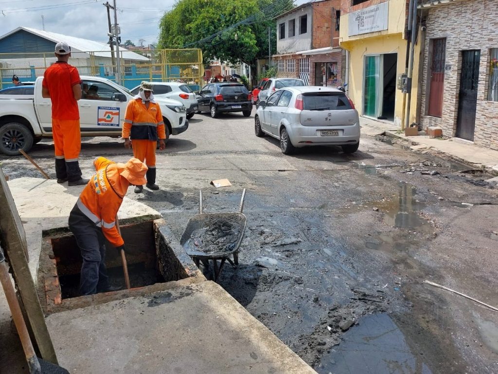 Ação #paratodosverem – Equipe da Seminf realizando a recuperação de drenagem na rua Mauá da Serra, no bairro Zumbi dos Palmares