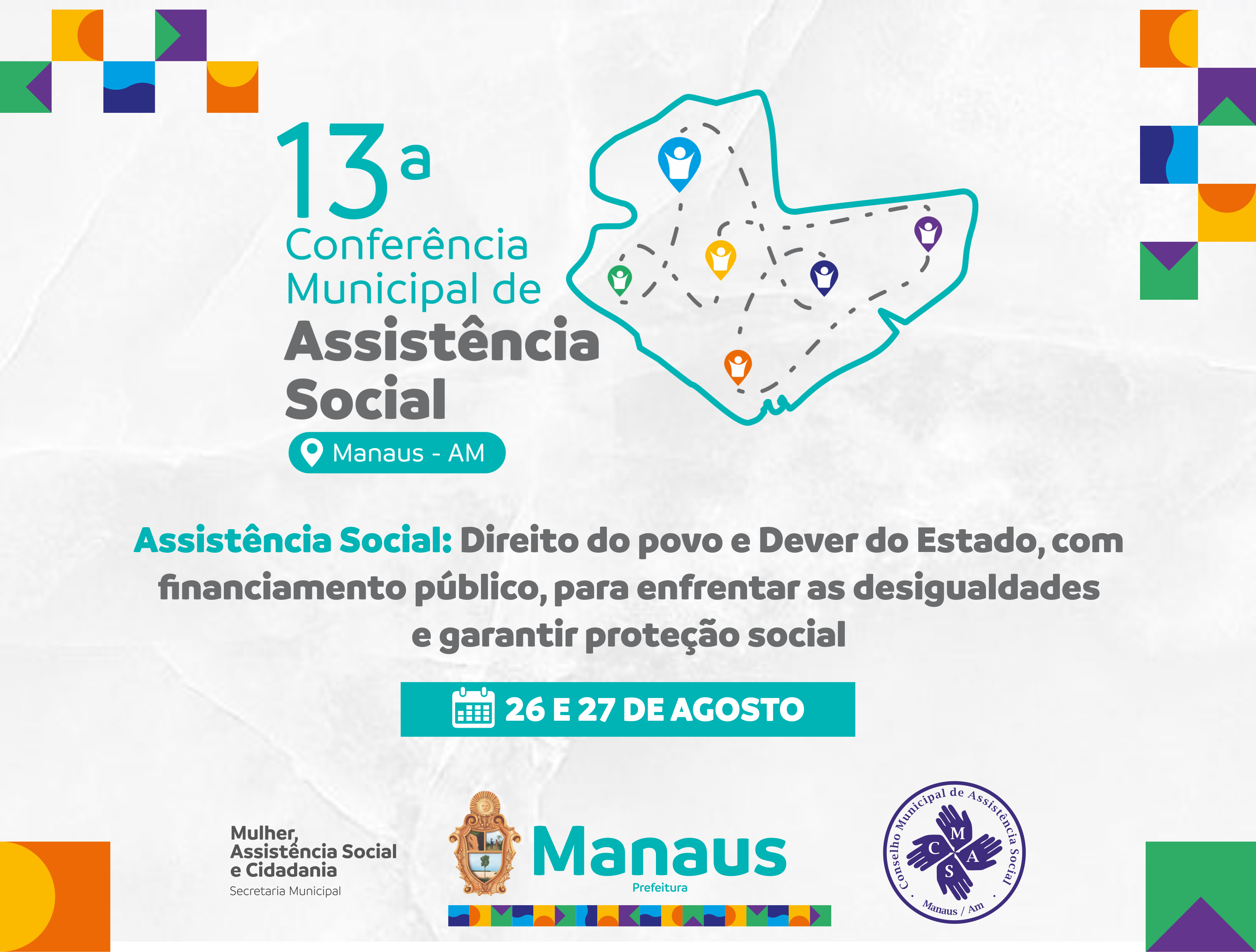 O Conselho Municipal de Assistência Social (CMAS), com o apoio da Prefeitura de Manaus, por meio da Secretaria Municipal da Mulher, Assistência Social e Cidadania (Semasc), promove, entre os dias 26 e 27 de agosto, a 13ª Conferência Municipal de Assistência Social, com o tema “Assistência social: direito do povo e dever do Estado, com financiamento público, para enfrentar as desigualdades e garantir proteção social”. O evento será realizado no auditório da Faculdade Boas Novas, na avenida Rodrigo Otávio, bairro Japiim, zona Sul, em frente à Universidade Federal do Amazonas.