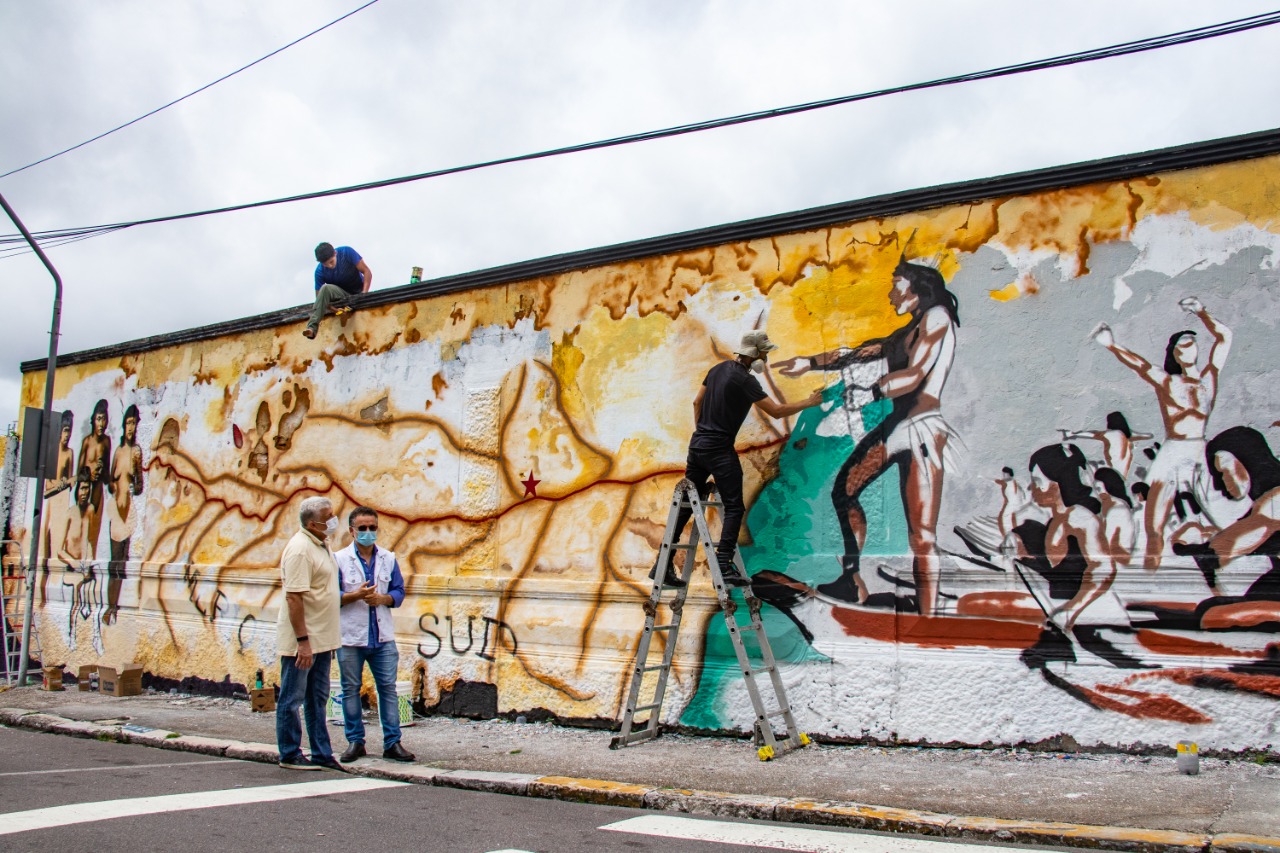 “São quatro imagens nos 140 metros quadrados do mural retiradas de livros históricos, mostrando o mapa das calhas dos rios onde existe a forte presença dos povos indígenas no Amazonas desde muito antes da presença europeia, além do herói-ícone da luta, o grande  Ajuricaba; ainda os Manaos e o cemitério indígena  na visão do colonizador quando aqui chegou”, explica o diretor-presidente da Fundação Municipal Cultura, Turismo e Eventos (Manauscult), Alonso Oliveira.