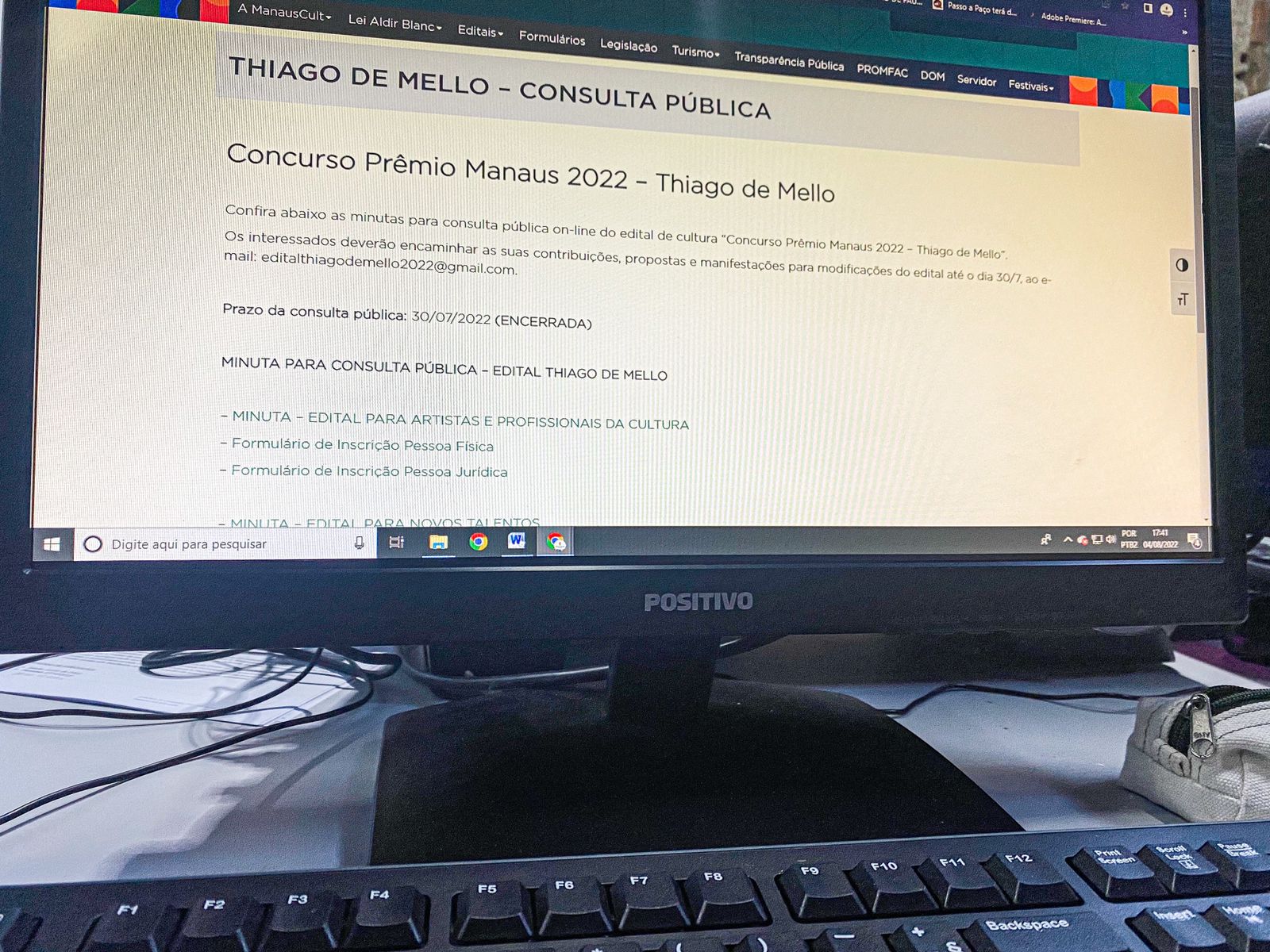 A Prefeitura de Manaus divulgou, nesta quinta-feira, 4/8, por meio da Fundação Municipal de Cultura, Turismo e Eventos (Manauscult), a devolutiva da consulta pública on-line da minuta do edital de cultura “Concurso Prêmio Manaus 2022 – Thiago de Mello”. As respostas podem ser consultadas na aba “editais” do site manauscult.manaus.am.gov.br.