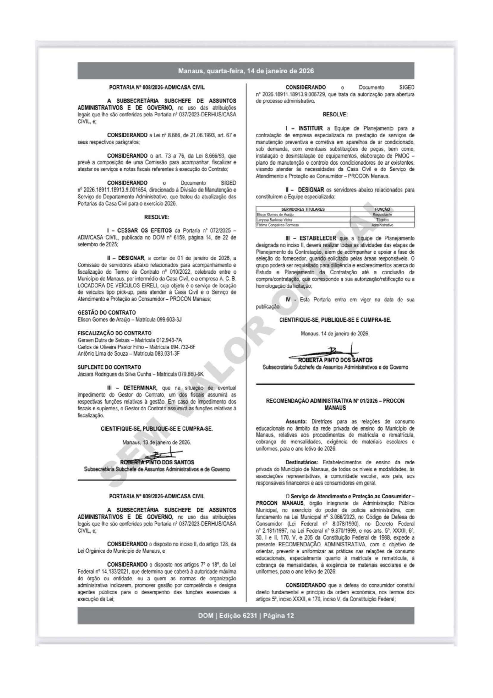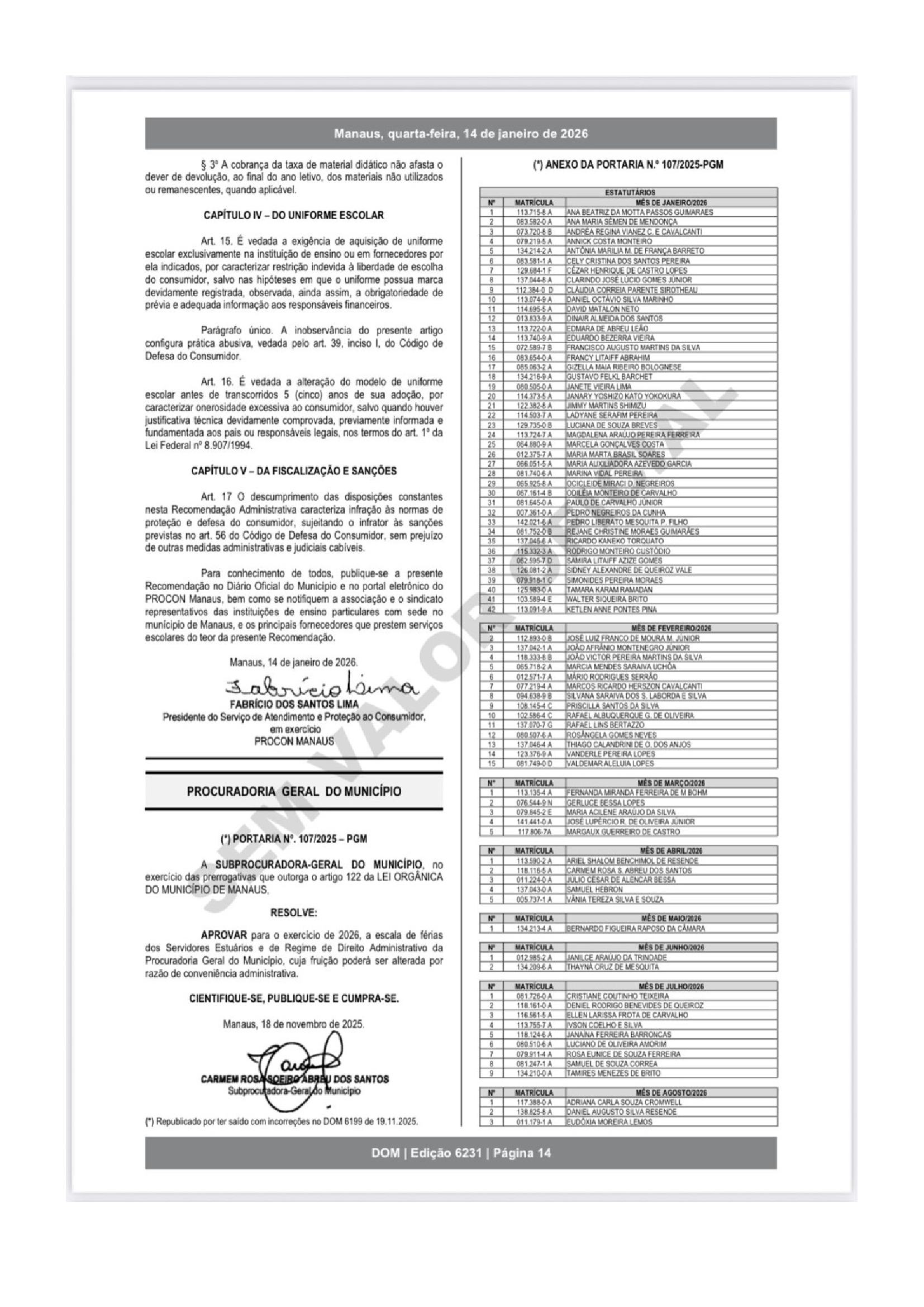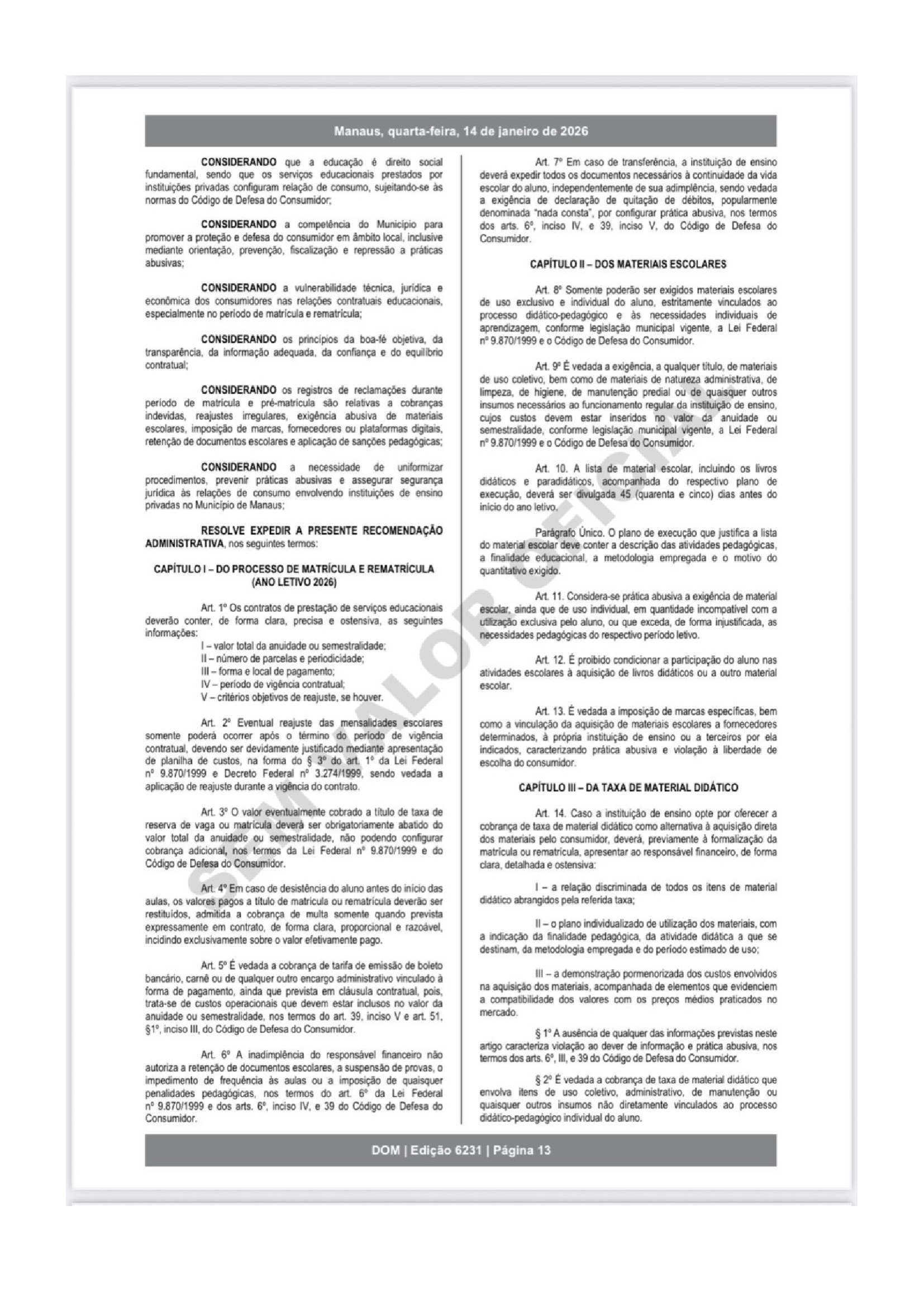 A Prefeitura de Manaus, por meio do Serviço de Atendimento e Proteção ao Consumidor (Procon Manaus), publicou, na edição 6.231 do Diário Oficial do Município (DOM), de quarta-feira, 14/1, uma recomendação administrativa que estabelece diretrizes para as relações de consumo no âmbito das instituições privadas de ensino do município, especialmente durante o período de matrícula e rematrícula para o ano letivo de 2026.