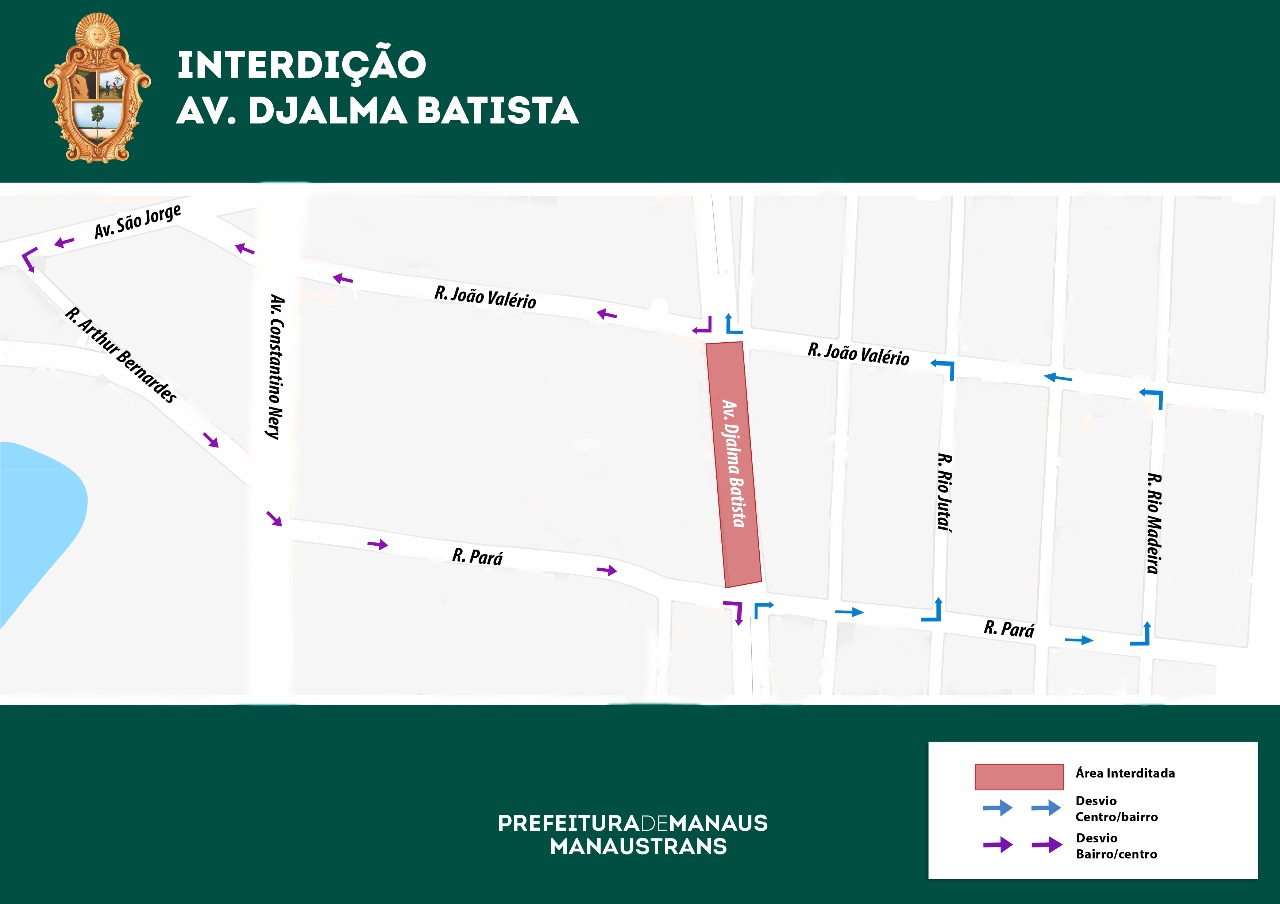 A partir das 9h da sexta-feira, 9/3, a avenida Djalma Batista, zona Centro-Sul, será interditada no trecho entre as ruas Pará e João Valério, nos dois sentidos de tráfego, para a execução dos trabalhos de recuperação da rede de drenagem profunda da área. Os condutores que seguem pela Djalma Batista poderão desviar do trecho interditado fazendo os seguintes desvios: