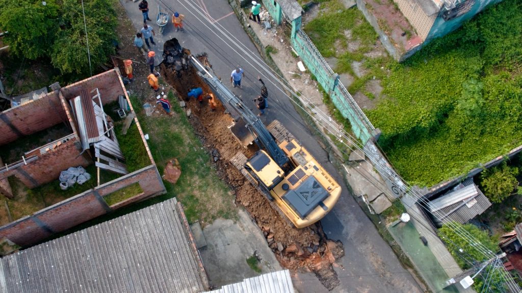 Outra intervenção que marcou este ano foi realizada na rua Papiro, no bairro Coroado, onde uma cratera com cerca de três metros de profundidade comprometia a mobilidade e colocava em risco moradores e motoristas. As equipes da Seminf atuaram na revisão e implantação de aproximadamente 50 metros de nova tubulação, garantindo maior sustentação e segurança ao escoamento das águas pluviais.