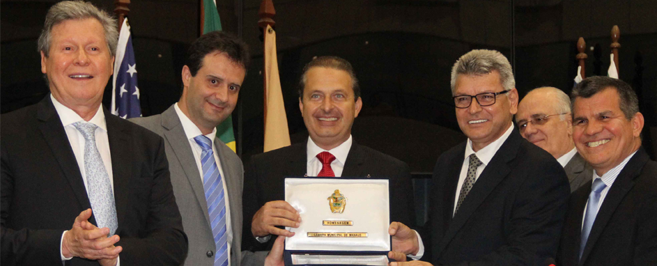 O diploma do mérito da Cidade de Manaus foi uma autoria do vereador Elias Emanuel e do líder do PSB na Câmara, Marcelo Serafim. Quando ainda era governador de Pernambuco, Eduardo Campos possibilitou a criação de um entreposto da Zona Franca de Manaus (ZFM) em Ipojuca (PE), diminuindo em 12 dias o escoamento do Polo Industrial de Manaus (PIM) para todo o Nordeste do país.