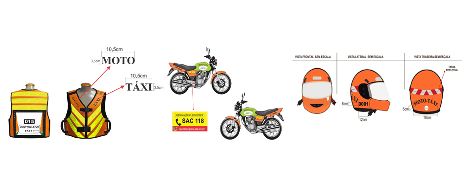 Os capacetes, do condutor e passageiro, também deverão ser na cor laranja boreal, com a palavra mototáxi pintada na parte de trás. A presença da tarja refletiva e do número da permissão, em conformidade com padrão do projeto básico, também são itens obrigatórios.