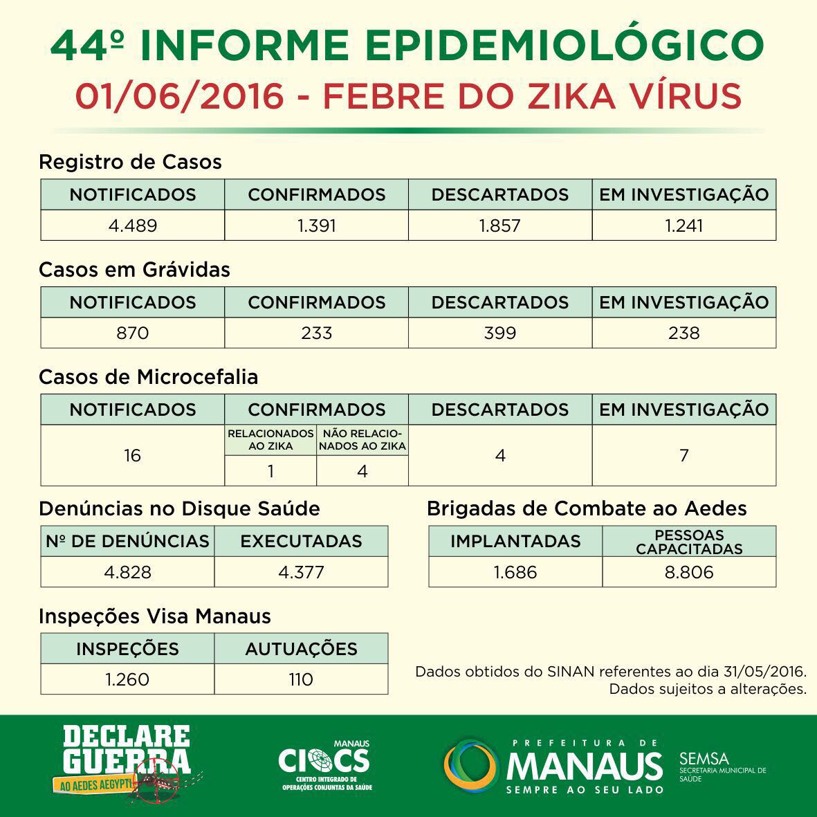 De acordo com 44º Informe Epidemiológico da Febre do Zika Vírus da Semsa, divulgado na última quarta-feira, 1º, Manaus contabiliza 1.391 casos confirmados de infecção pelo zika vírus, entre eles, 233 registrados em mulheres grávidas. A capital continua com apenas um caso de microcefalia relacionado ao vírus (adquirido em Boa Vista).