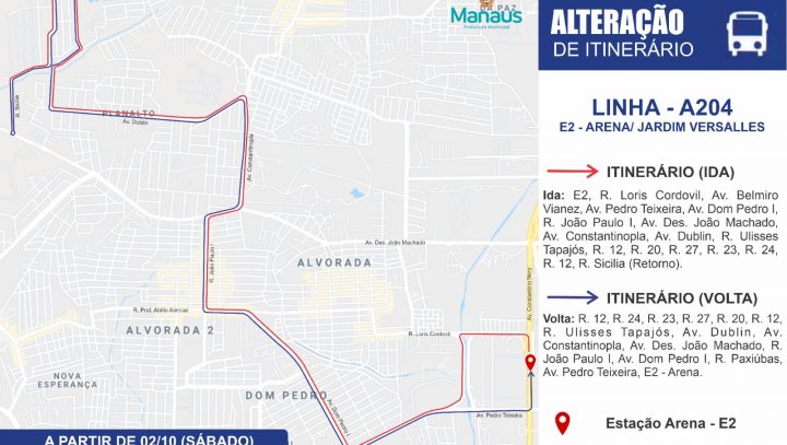 A Prefeitura de Manaus, por meio do Instituto Municipal de Mobilidade Urbana (IMMU), informa que a linha de ônibus A204 que atende o conjunto Jardim Versalles, bairro Planalto, zona Centro-Oeste, passará a receber os passageiros do parque Mosaico, no mesmo bairro. A mudança tem a finalidade de prestar melhor qualidade aos usuários e ganhar mais tempo nas viagens.