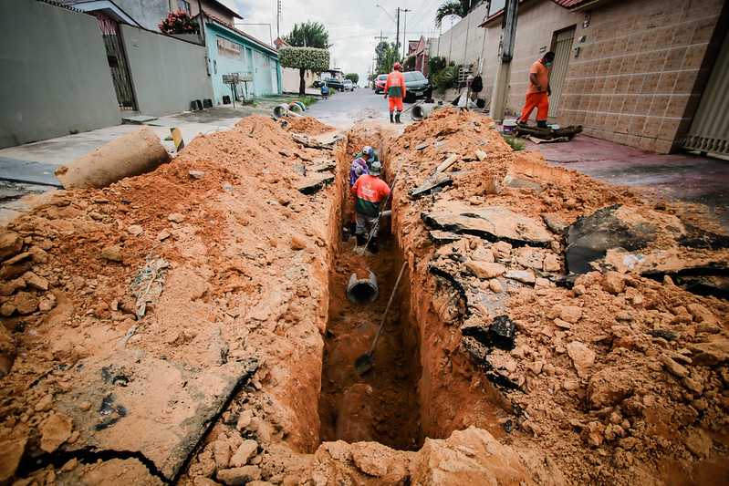A Prefeitura de Manaus trabalha na recuperação de aproximadamente 25 metros de drenagem profunda, rompida na rua Rio Mutuca, no bairro Colina do Aleixo, zona Leste. Os serviços foram iniciados nesta quinta-feira, 4/11, de forma emergencial. Duas equipes da Secretaria Municipal de Infraestrutura (Seminf) trabalham na troca das tubulações, que foram comprometidas em função de uma construção irregular sob a tubulação, que provocou a erosão.