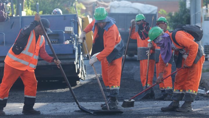 A equipe de obras atua no local com cerca de dez funcionários, realizando um serviço de tratamento da base e, posteriormente, aplicando a massa asfáltica com a ajuda de retroescavadeira, vibroacabadora, rolo compressor e caminhões, dando celeridade ao serviço.