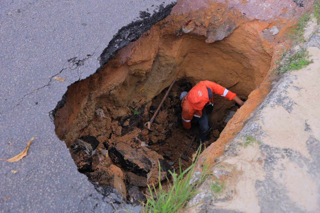 A obra é realizada de forma célere e eficiente, as equipes trabalham na substituição dos tubos que estavam deteriorados em decorrência das chuvas torrenciais dos dias anteriores. O volume de água associado ao descarte incorreto do lixo sobrecarregou o sistema de escoamento e causou o rompimento do trecho da tubulação.