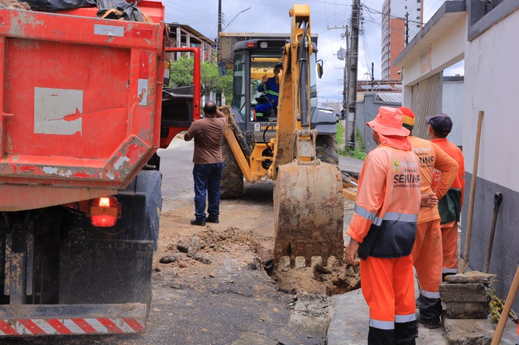 As equipes da Seminf realizam a manutenção em aproximadamente 10 metros de extensão, com a substituição dos tubos antigos por novas manilhas mais resistentes, além do reforço estrutural da tubulação. O serviço garante mais durabilidade ao sistema de drenagem e previne novos problemas, especialmente no período chuvoso.