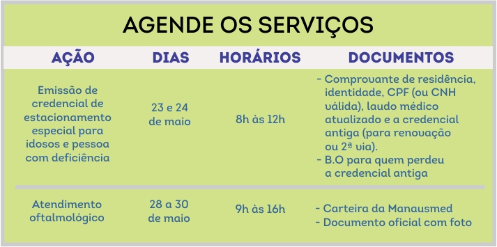 Duas ações promovidas pela Prefeitura de Manaus fecham as programações do mês de maio com os aposentados e pensionistas da Manaus Previdência. Nos dias 23 e 24, acontecerá o serviço credenciamento de estacionamento especial para idosos e pessoa com deficiência. De 28 a 30, será oferecido atendimento oftalmológico gratuito aos segurados.