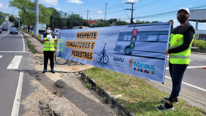 A Prefeitura de Manaus realizou, nesta sexta-feira, 3/9, mais uma ação educativa “Atravesse na Faixa”, que faz parte do programa “Educação para o Trânsito”. O Instituto Municipal de Mobilidade Urbana (IMMU) promoveu a atuação nas imediações de uma faixa de pedestre da avenida Grande Circular, na zona Leste. Com faixas e distribuição de material educativo, os servidores abordaram condutores, pedestres e ciclistas sobre a importância de respeitar a faixa de pedestre.