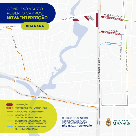 A partir da próxima segunda-feira, 2/9, a rua Pará será interditada no trecho entre as avenidas Constantino Nery e Djalma Batista para garantir o avanço da obra do Complexo Viário Ministro Roberto Campos, a maior intervenção viária do Amazonas que está sendo executada pela Prefeitura de Manaus. Com essa, completam-se três frentes de obras simultâneas no extenso canteiro, que se entende pelas avenidas João Valério e São Jorge.