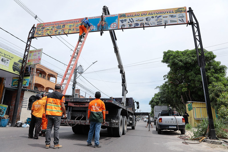 Pórtico de publicidade irregular é demolido no Distrito Industrial como ação de reordenamento urbano de Manaus