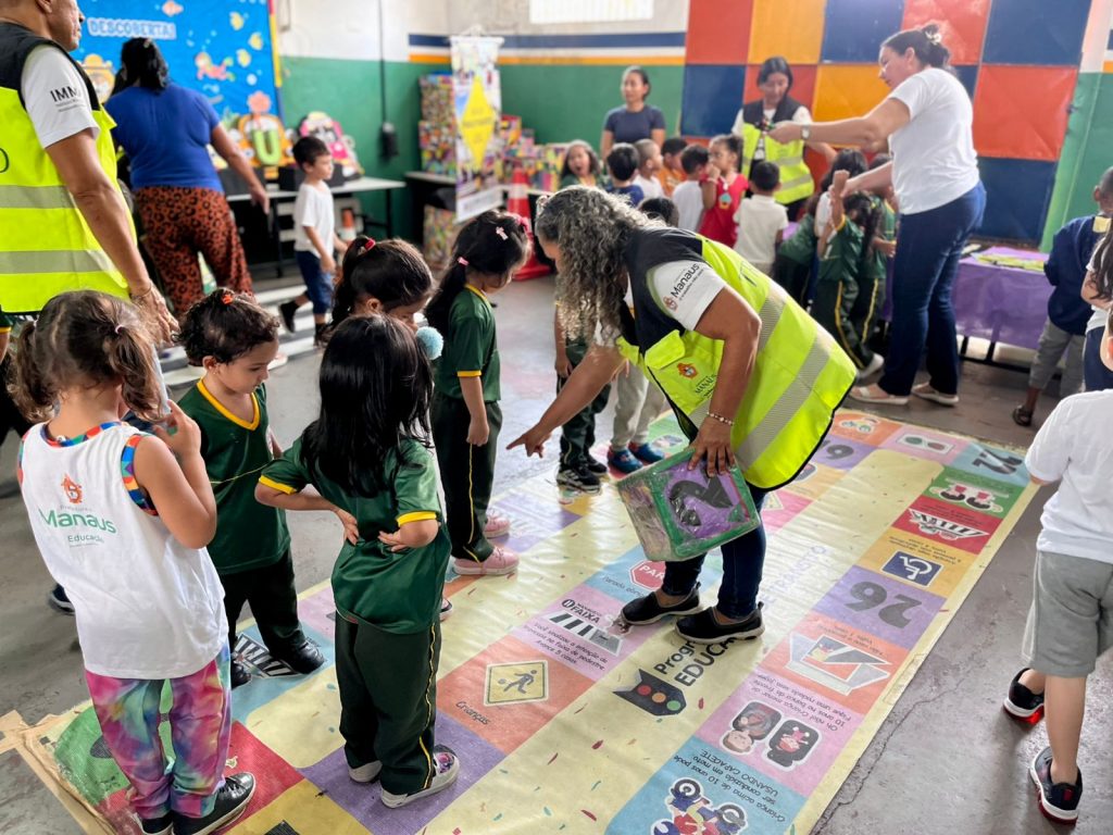 Com olhos atentos e curiosos, crianças do Centro Municipal de Educação Infantil (Cmei) Poeta Álvares de Azevedo, na zona Norte, acompanharam, nesta quarta-feira, 25/3, a ação “Trânsito na Escola” promovida pela Prefeitura de Manaus, por meio do Instituto Municipal de Mobilidade Urbana (IMMU). Os pequenos, com idade entre três e cinco anos, receberam informações básicas sobre regras de trânsito e como evitar acidentes quando for atravessar em avenidas e ruas da cidade.