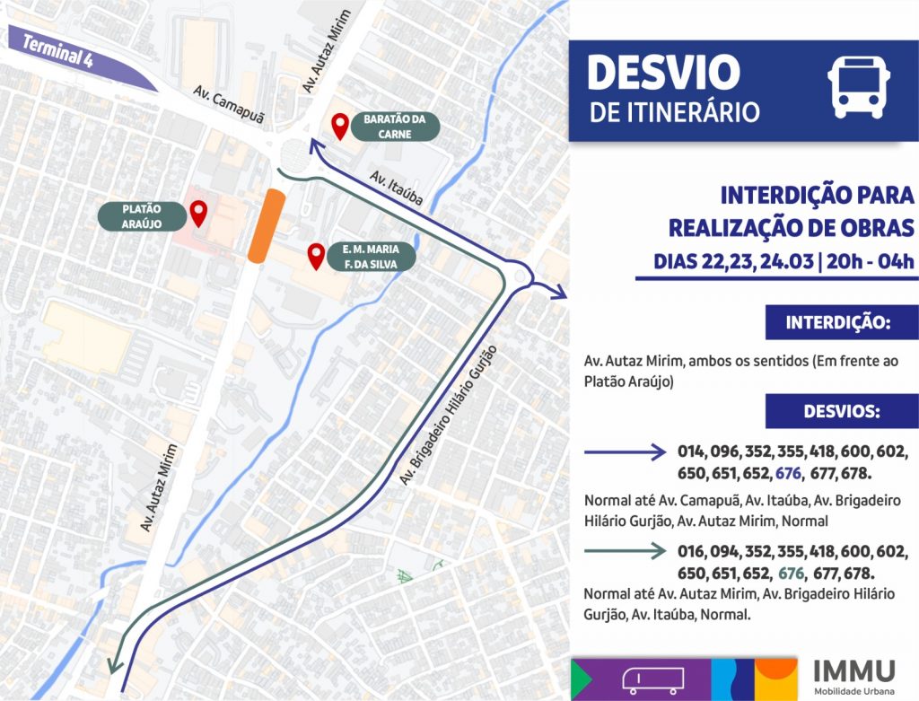 A Prefeitura de Manaus, por meio do Instituto Municipal de Mobilidade Urbana (IMMU), informa que, entre os dias 22 e 25/3, haverá interdições parciais e temporárias na avenida Autaz Mirim nas imediações das obras do complexo viário Rei Pelé. As interdições serão necessárias para realizar transporte de vigas para a obra que ocorrerão sempre entre 20h e 4h.