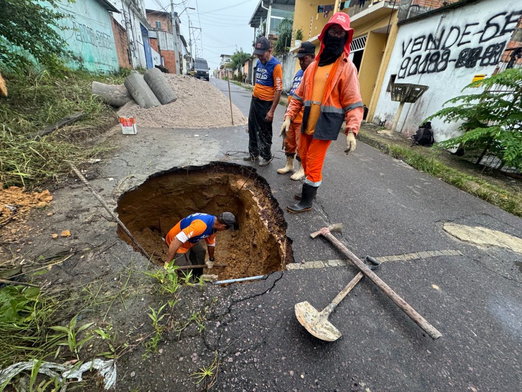 A Prefeitura de Manaus, por meio da Secretaria Municipal de Infraestrutura (Seminf), intensificou, nesta segunda-feira, 23/2, os serviços de manutenção da rede de drenagem profunda em diferentes pontos da capital. Um dos locais atendidos foi a rua Acácia do Nilo, no bairro Novo Aleixo, zona Norte, onde a força das chuvas, aliada ao descarte irregular de lixo, provocou o desanelamento da tubulação e a abertura de uma cratera na via.