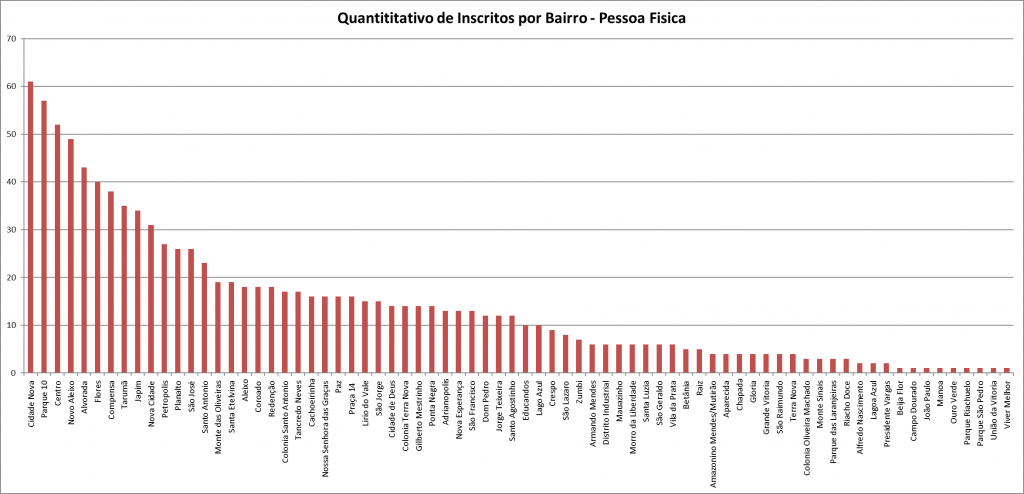 A equipe técnica da Manauscult realizou o mapeamento cultural da cidade a partir dos editais de fomento à cultura e do Cadastro de Artistas, divididos entre os segmentos culturais, bairros e considerando as pessoas físicas e jurídicas, com destaque para o bairro Cidade Nova com o maior número de inscritos.