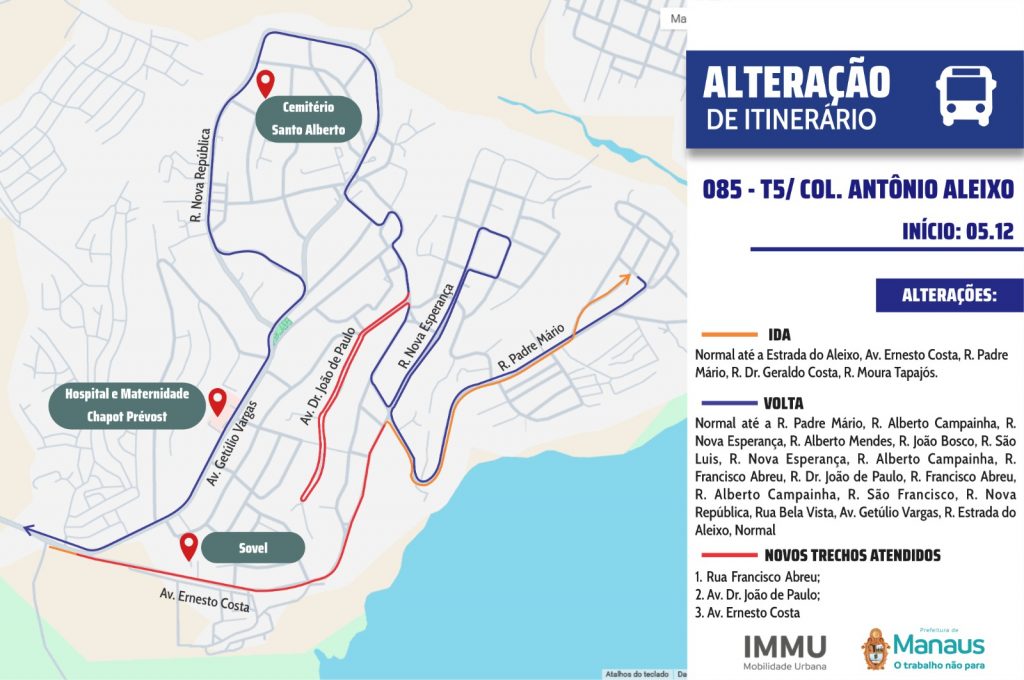 A Prefeitura de Manaus, por meio do Instituto Municipal de Mobilidade Urbana (IMMU), fará mudanças no itinerário da linha 085 – T5/Colônia Antônio Aleixo, zona Leste, que passam a valer a partir desta sexta-feira, 5/12. As alterações foram definidas para aprimorar a circulação dos ônibus na zona Leste e ampliar a cobertura do transporte público em áreas de grande demanda.