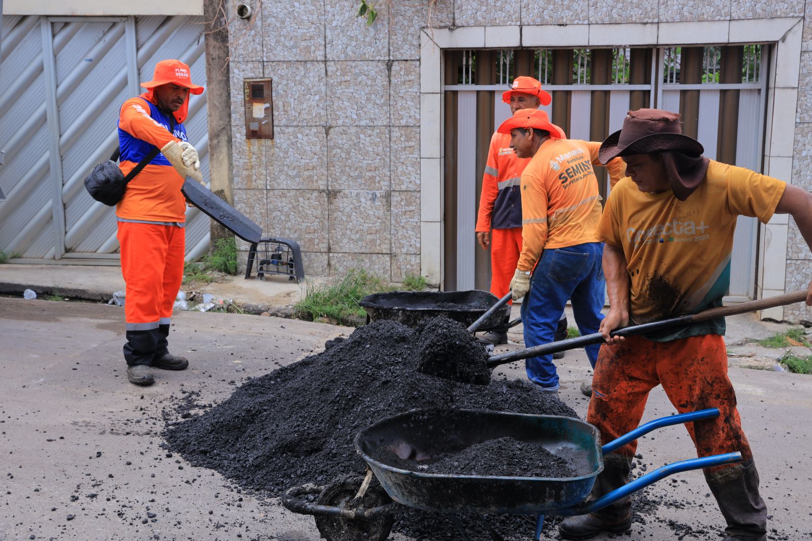Recuperação #paratodosverem – Equipe da Seminf realizando a recuperação asfáltica em via do bairro Japiim