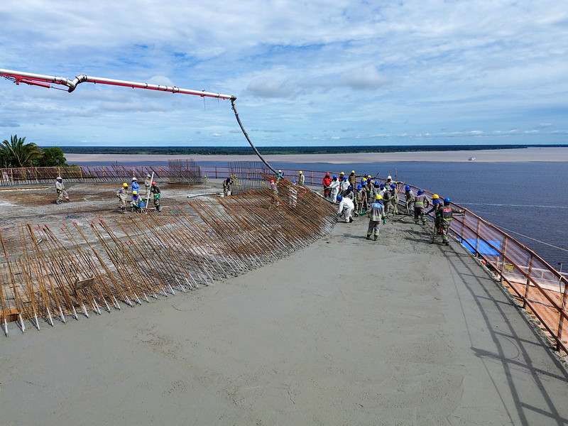A estrutura de concreto, projetada pelo arquiteto Oscar Niemeyer para o parque Encontro das Águas Rosa Almeida, passa por um grande avanço arquitetônico e estrutural nesta sexta-feira, 13/2, com a concretagem das vigas e lajes da oca, espaço multiuso em construção pela Prefeitura de Manaus. Desde 7h e até o fim do dia, entrando pela noite, será usado um volume estimado em 380 metros cúbicos de concreto, o equivalente a algo em torno de 50 a 60 caminhões betoneira de uma única vez.