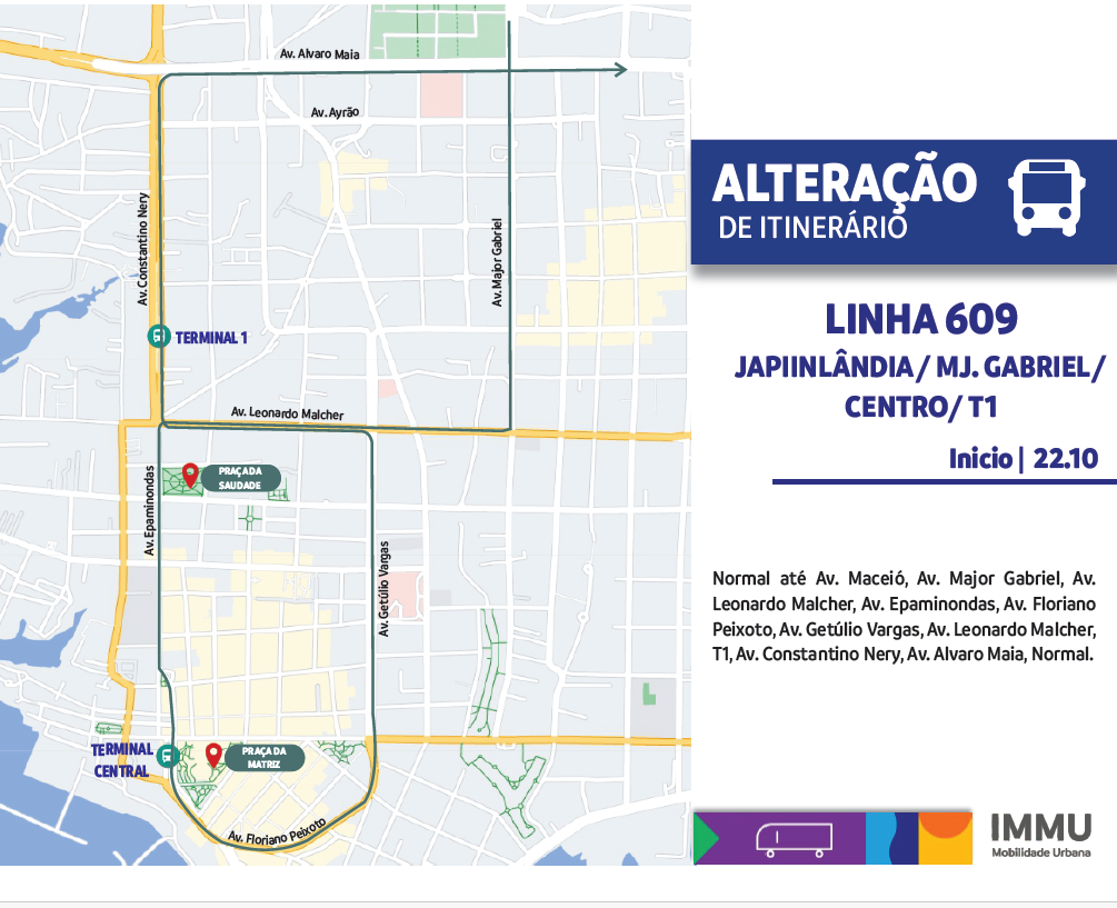 A linha 609 terá o seguinte itinerário: normal até a rua Maceió, rua Major Gabriel, avenida Leonardo Malcher, avenida Epaminondas, Terminal Central, avenida Getúlio Vargas, avenida Leonardo Malcher, T1, seguindo o itinerário normal.