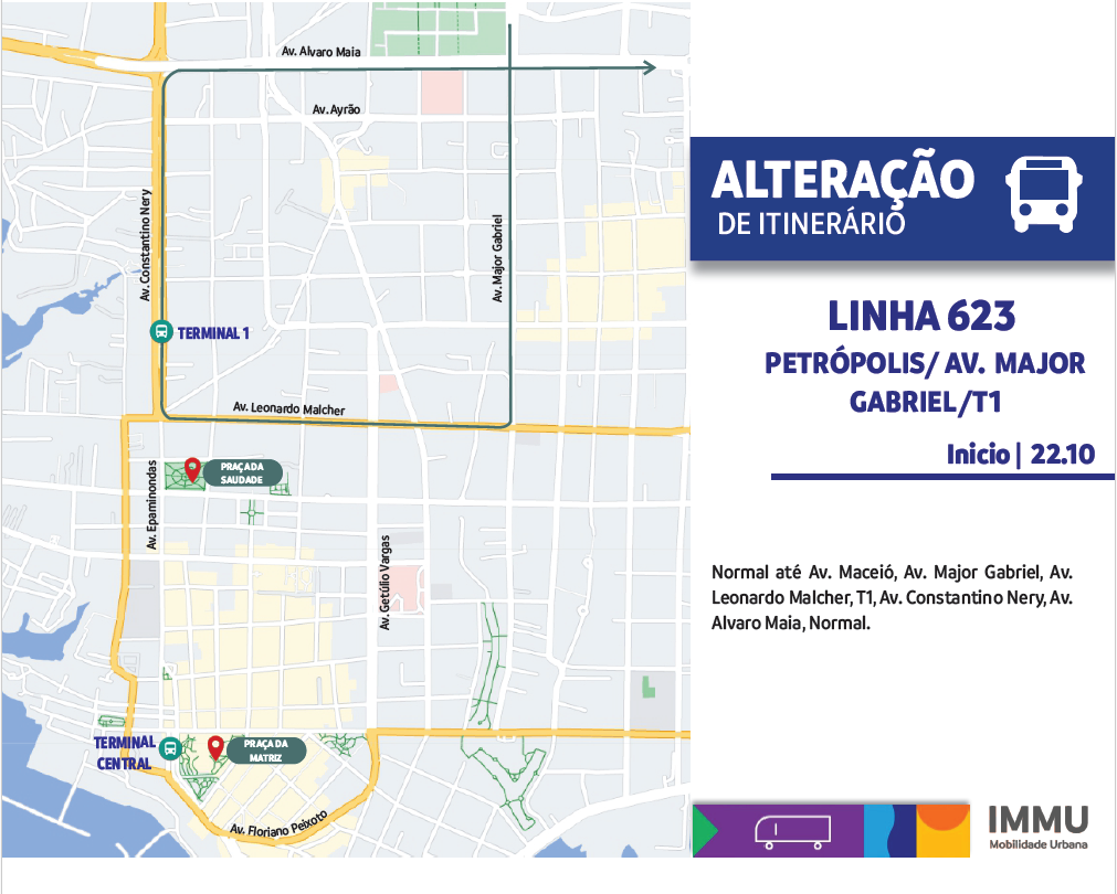 Por fim, também a partir de domingo, a linha 623 – Petrópolis/Major Gabriel/ T1, terá seu itinerário alterado, deixando de atender o retorno no centro de convivência. A linha seguirá o itinerário normal até a rua Maceió, depois rua Major Gabriel, avenida Leonardo Malcher, T1 e segue itinerário normal.