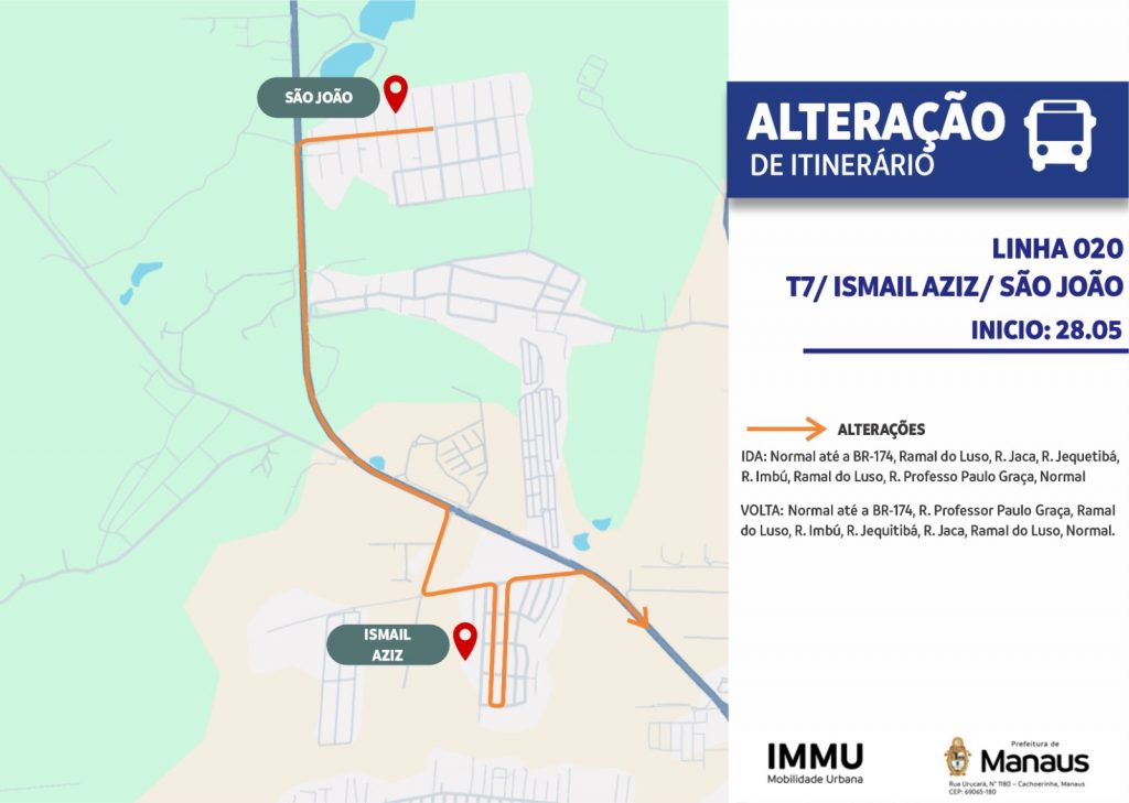 A Prefeitura de Manaus, por meio do Instituto Municipal de Mobilidade Urbana (IMMU), informa que, a partir da quarta-feira, 28/5, a linha 020 (comunidade São João/ T7) passará a atender a comunidade Ismail Aziz, no bairro Tarumā, zona Oeste da capital. A alteração tem como objetivo melhorar o atendimento do transporte na região.