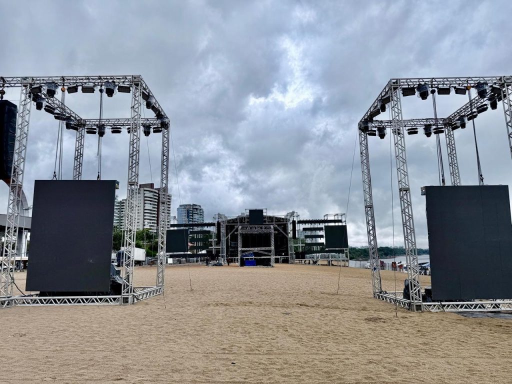 Durante a visita técnica, o prefeito verificou de perto a montagem dos palcos, sistemas de som, iluminação e áreas de apoio que irão receber milhares de pessoas nos dois dias de evento. Na Ponta Negra, a estrutura principal impressiona pela dimensão: o palco possui 70 metros de boca de cena e uma área total de aproximadamente 30 mil metros quadrados, garantindo conforto, visibilidade e segurança ao público.