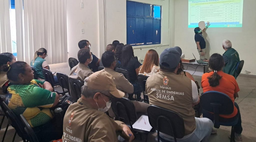Reunião #paratodosverem – Técnicos de saúde da Semsa participando de reunião para a divulgação do funcionamento da nova metodologia de controle do Aedes aegypti em Manaus
